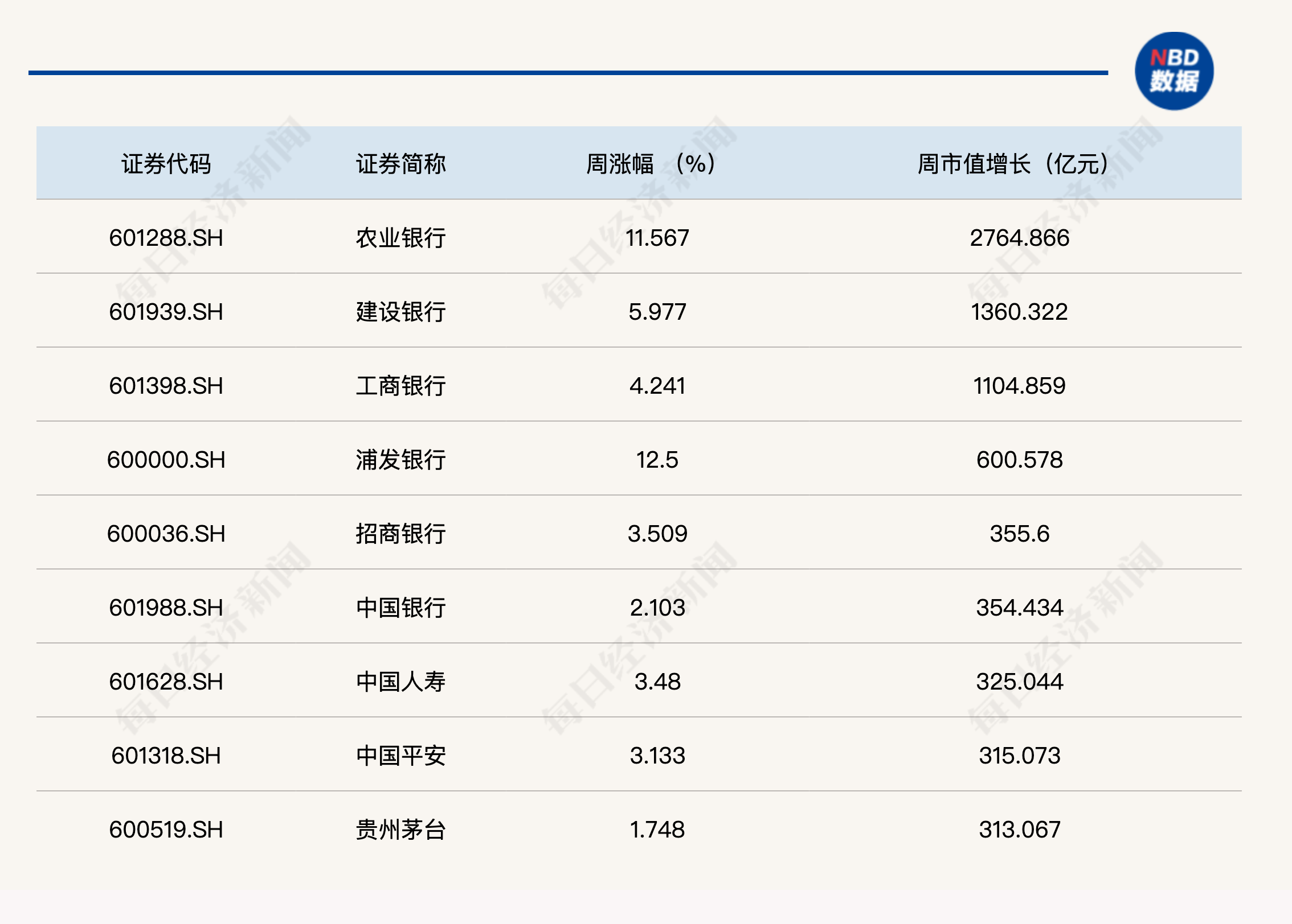 周市值增長方面,農(nóng)業(yè)銀行周市值增長高達(dá)2764.87億元,建設(shè)銀行和工商銀行周市值增長也分別達(dá)到1360.32億元和1104.86億元。