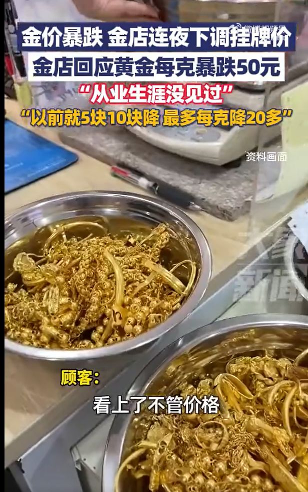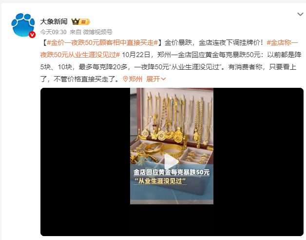 據大象新聞,10月22日,鄭州一金店回應黃金每克跌50元:以前都是降5塊、10塊,最多每克降20多,一夜降50元“從業生涯沒見過”。有消費者稱,只要看上了,不管價格直接買走了。