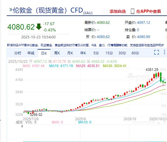 截至10月23日發稿,現貨黃金報4080.62美元/盎司,跌0.43%。