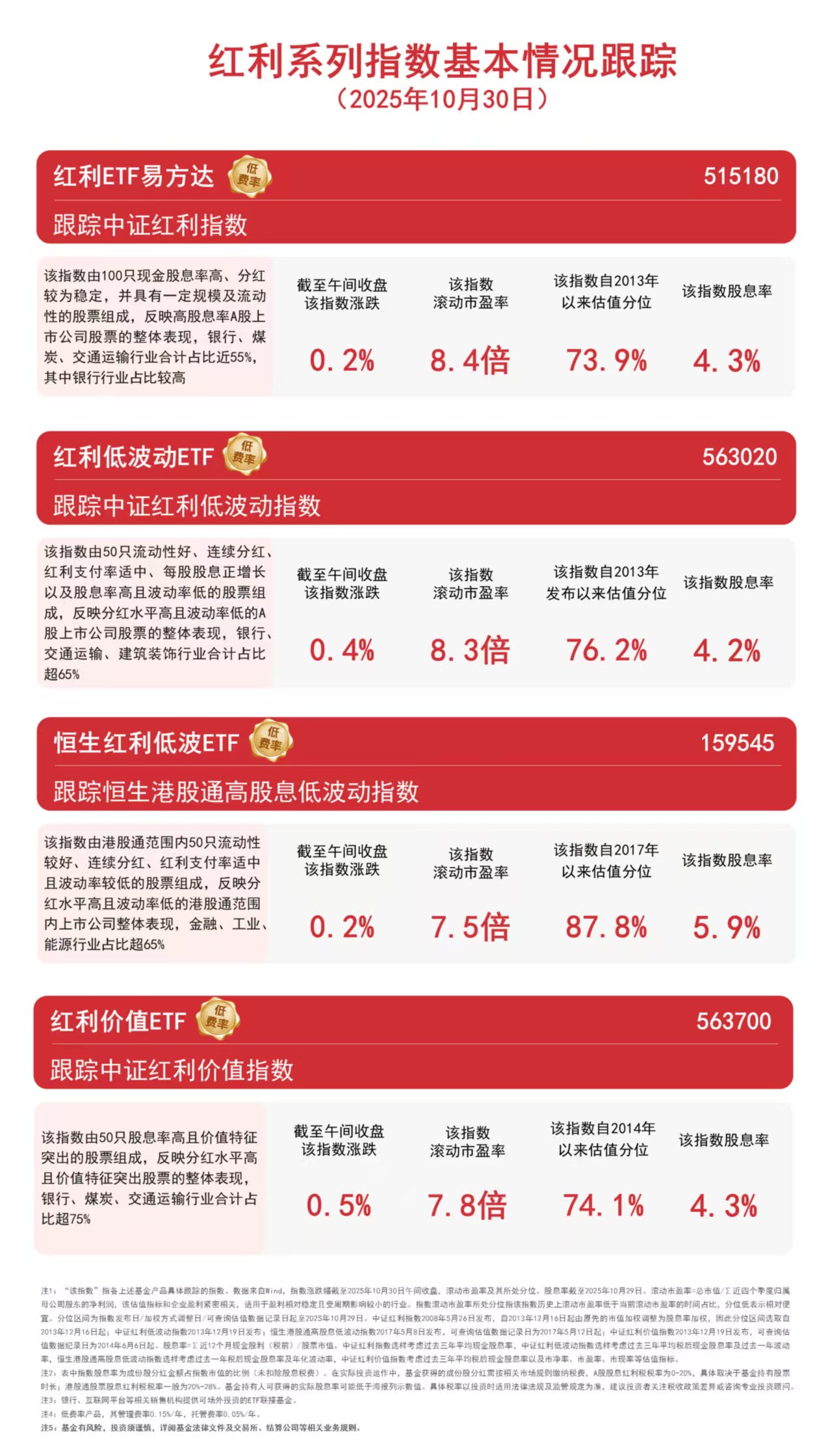 截至午間收盤,中證紅利價值指數上漲0.5%,中證紅利低波動指數上漲0.4%,中證紅利指數、恒生港股通高股息低波動指數均上漲0.2%,恒生紅利低波ETF(159545)半日凈申購超4000萬份。Wind數據顯示,截至昨日,紅利ETF易方達(515180)月內“吸金”超16億元。