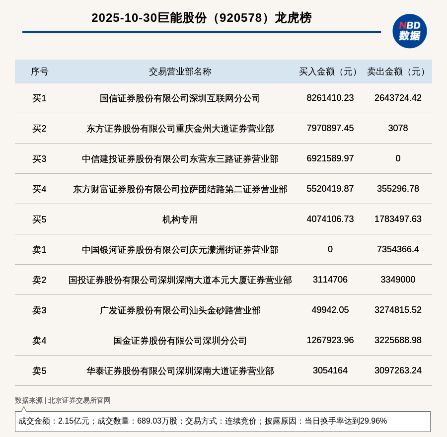 每經(jīng)訊,2025年10月30日,北交所上市公司巨能股份(920578,收盤價(jià):30.35元)登上龍虎榜,交易方式是連續(xù)競(jìng)價(jià),披露原因是當(dāng)日換手率達(dá)到29.96%,成交數(shù)量689.03萬股,成交金額2.15億元。買一席位為國信證券股份有限公司深圳互聯(lián)網(wǎng)分公司,買入826.14萬元;賣一席位為中國銀河證券股份有限公司慶元濛洲街證券營業(yè)部,賣出735.44萬元。