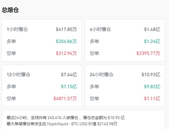 受此影響,過去24小時內,全球加密貨幣市場共有超過24萬人爆倉,爆倉金額達10.93億美元(約合人民幣78億元)。