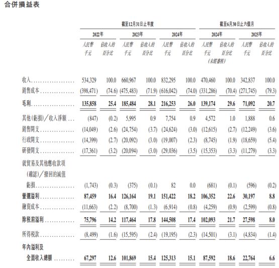 2022年、2023年、2024年以及2025年上半年(以下簡稱報告期),公司分別實現營業收入約5.34億元、6.61億元、8.32億元以及3.43億元,分別實現凈利潤約6729.7萬元、1.02億元、1.25億元以及2276.4萬元。