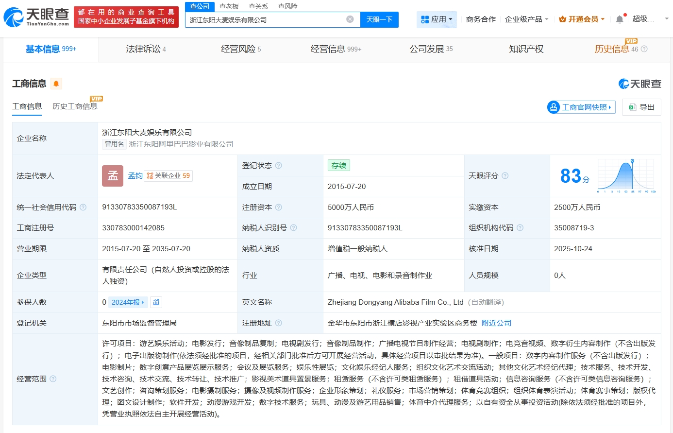 每經AI快訊,天眼查App顯示,近日,浙江東陽阿里巴巴影業有限公司發生工商變更,企業名稱變更為浙江東陽大麥娛樂有限公司,同時經營范圍及部分高管也發生變更。該公司成立于2015年7月,法定代表人為孟鈞,注冊資本5000萬元,經營范圍包括游藝娛樂活動、電影發行、音像制品復制、電視劇發行等,由北京大麥淘娛樂有限公司全資持股。