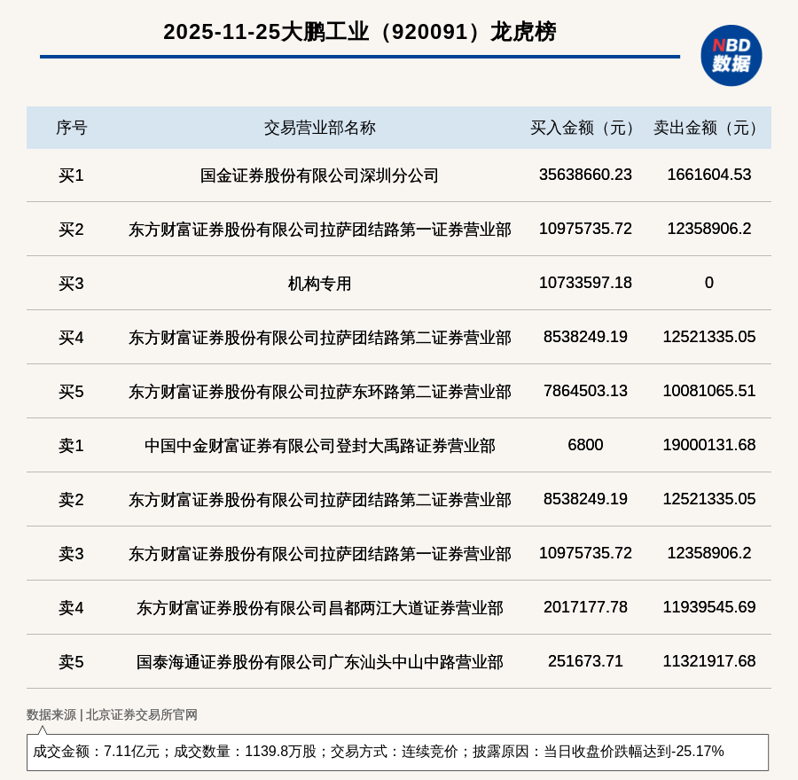 每經訊,2025年11月25日,北交所上市公司大鵬工業(920091,收盤價:61.81元)登上龍虎榜,交易方式是連續競價,披露原因是當日收盤價跌幅達到-25.17%,成交數量1139.8萬股,成交金額7.11億元。買一席位為國金證券股份有限公司深圳分公司,買入3563.87萬元;賣一席位為中國中金財富證券有限公司登封大禹路證券營業部,賣出1900.01萬元。