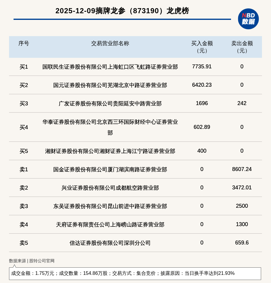 每經(jīng)訊,2025年12月9日,新三板基礎(chǔ)層公司摘牌龍參(873190,收盤價:0.01元)登上龍虎榜,交易方式是集合競價,披露原因是當(dāng)日換手率達(dá)到21.93%,成交數(shù)量154.86萬股,成交金額1.75萬元。買一席位為國聯(lián)民生證券股份有限公司上海虹口區(qū)飛虹路證券營業(yè)部,買入7735.91元;賣一席位為國金證券股份有限公司廈門湖濱南路證券營業(yè)部,賣出8607.24元。