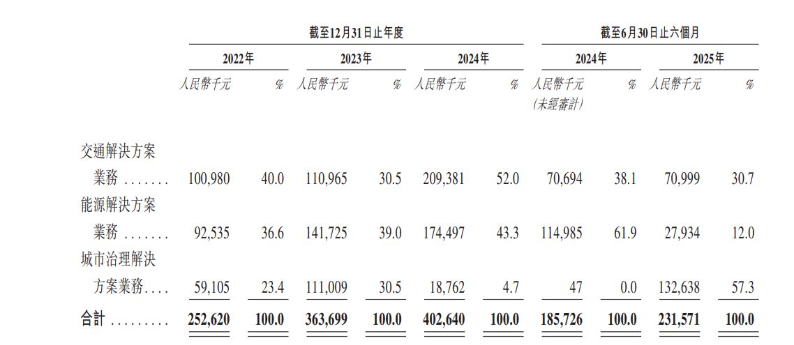 翻開聆訊資料,諾比侃的核心業務清晰呈現:以AI和數字孿生技術為核心,為交通、能源、城市治理三大領域提供軟硬件一體化解決方案,具體涵蓋交通解決方案、能源解決方案、城市治理解決方案。