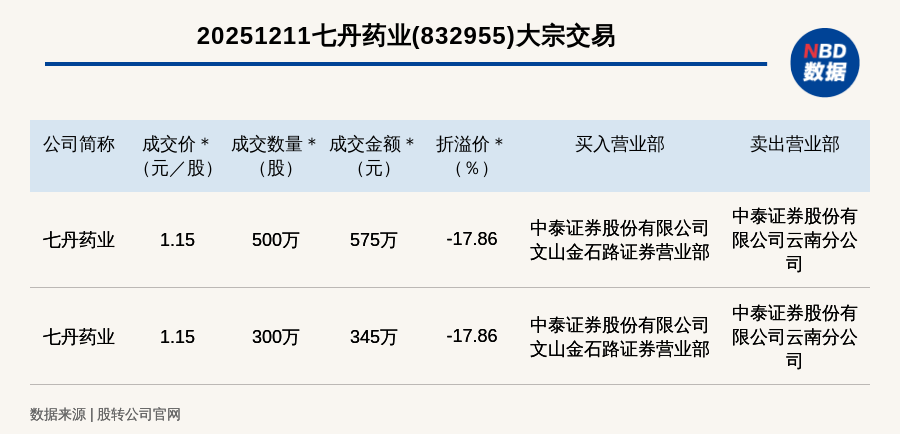 每經(jīng)訊,2025年12月11日,新三板基礎(chǔ)層公司七丹藥業(yè)(832955,收盤價(jià):1.4元)發(fā)生2筆大宗交易,總成交金額為920萬(wàn)元,成交金額最高的一筆成交價(jià)1.15元/股,成交數(shù)量500萬(wàn)股,成交金額575萬(wàn)元,折價(jià)17.86%。買入營(yíng)業(yè)部是中泰證券股份有限公司文山金石路證券營(yíng)業(yè)部,賣出營(yíng)業(yè)部是中泰證券股份有限公司云南分公司。