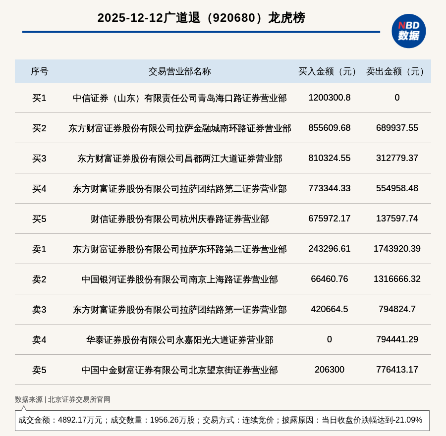 每經訊,2025年12月12日,北交所上市公司廣道退(920680,收盤價:2.17元)登上龍虎榜,交易方式是連續競價,披露原因是當日收盤價跌幅達到-21.09%,成交數量1956.26萬股,成交金額4892.17萬元。買一席位為中信證券(山東)有限責任公司青島海口路證券營業部,買入120.03萬元;賣一席位為東方財富證券股份有限公司拉薩東環路第二證券營業部,賣出174.39萬元。