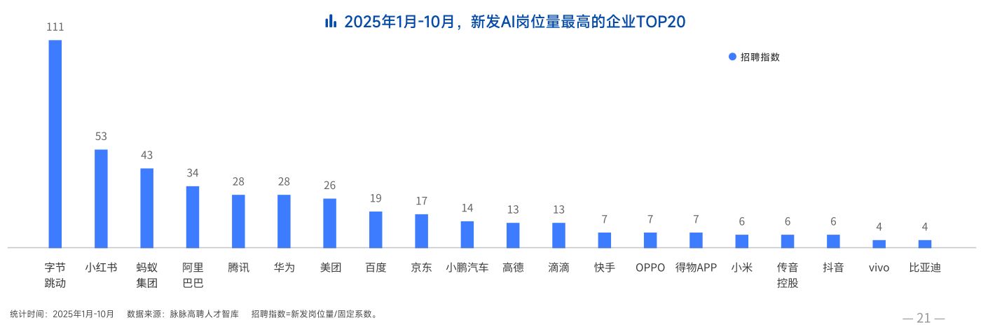 值得一提的是,數據顯示,2025年1—10?,新發AI崗位量最多的企業是字節跳動;?紅書、螞蟻集團對AI崗位的需求量緊隨其后,分列?、三位;阿?巴巴、騰訊對于AI崗位的需求量位居四、五。
