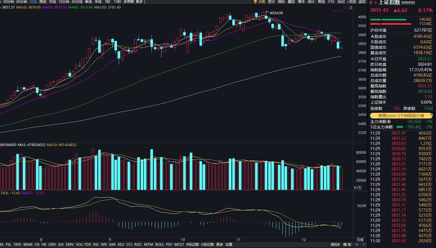 截至午間收盤,滬指上漲0.17%,報3831.43點;深成指上漲0.83%,報13021.35點;創業板指上漲1.21%,報3108.8點;科創50指數上漲0.32%,報1297.49點;北證50指數下跌0.83%,報1427.75點。全市場上漲個股有1579家,下跌個股有3727家,30只股漲停。兩市半日合計成交10249億元。