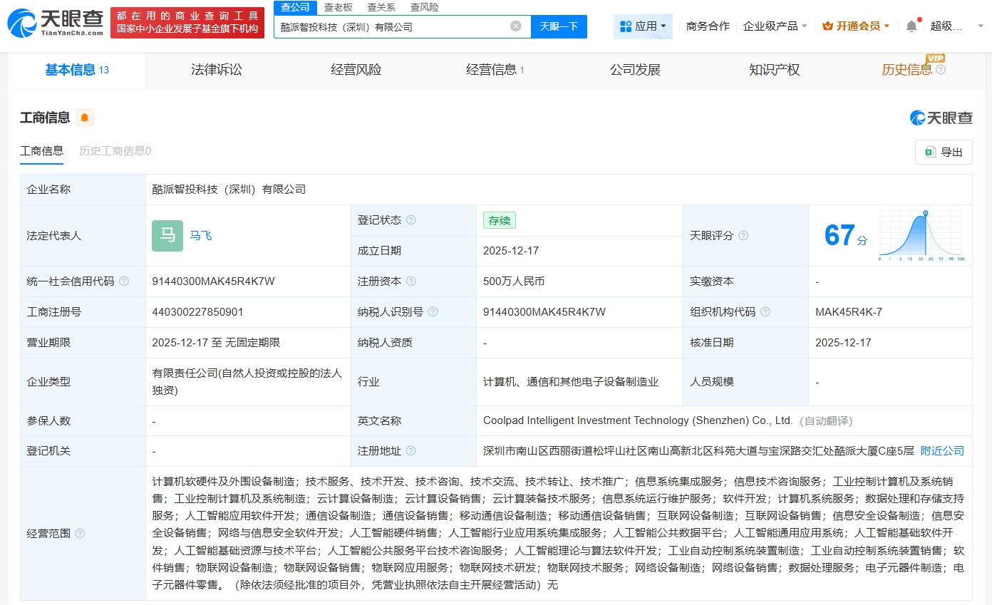 每經(jīng)AI快訊,天眼查App顯示,近日,酷派智投科技(深圳)有限公司成立,法定代表人為馬飛,注冊(cè)資本500萬元人民幣,經(jīng)營范圍包括計(jì)算機(jī)軟硬件及外圍設(shè)備制造、人工智能應(yīng)用軟件開發(fā)、人工智能行業(yè)應(yīng)用系統(tǒng)集成服務(wù)、人工智能公共數(shù)據(jù)平臺(tái)等。股東信息顯示,該公司由酷派關(guān)聯(lián)公司宇龍計(jì)算機(jī)通信科技(深圳)有限公司全資持股。