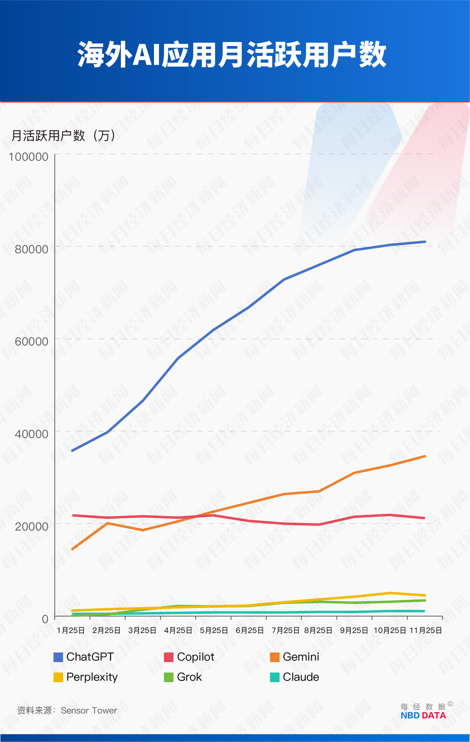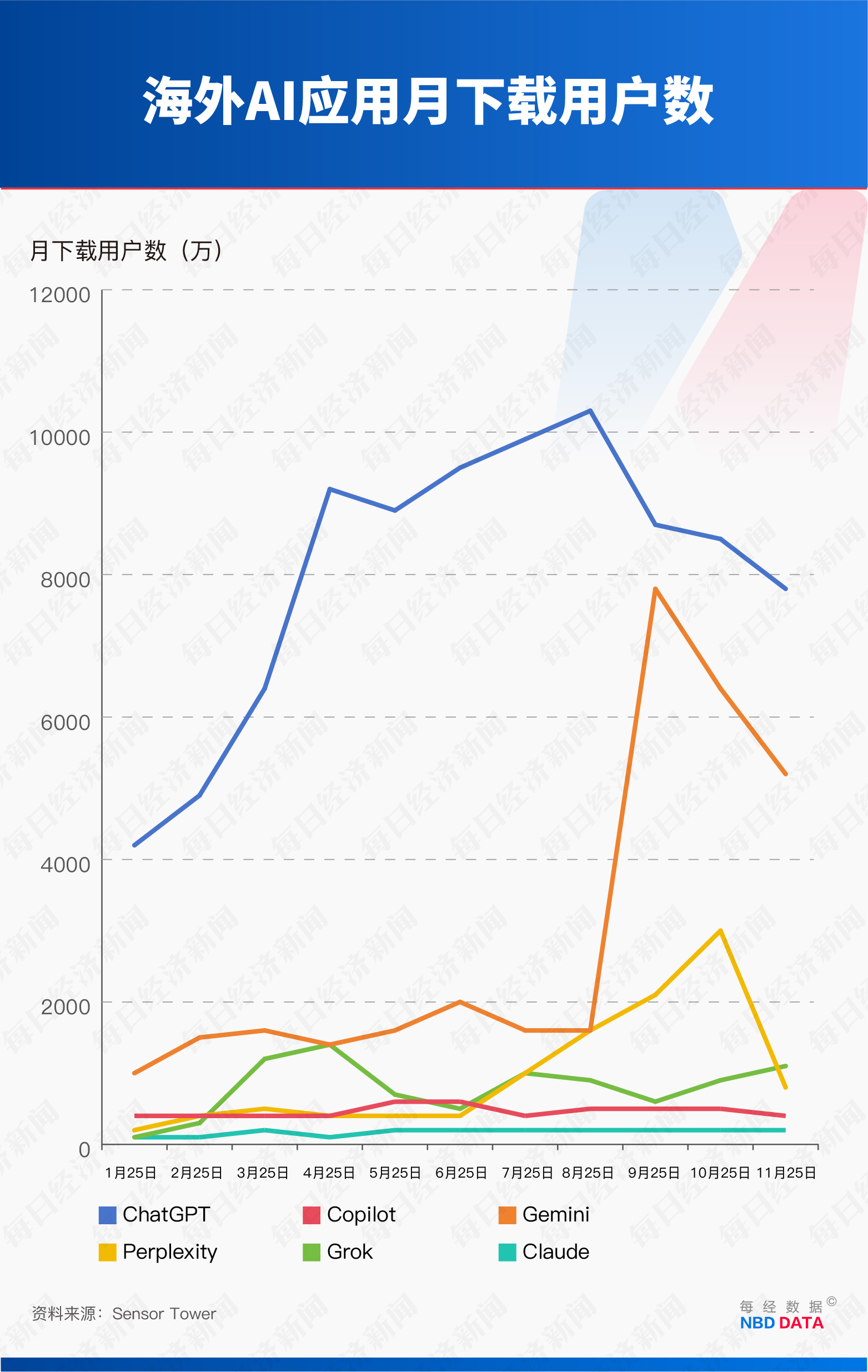海外AI市場同樣經歷格局輪換。11月中下旬,谷歌憑借Gemini 3、Nano Banana Pro等模型密集發布強勢回歸,OpenAI遭遇逆風。